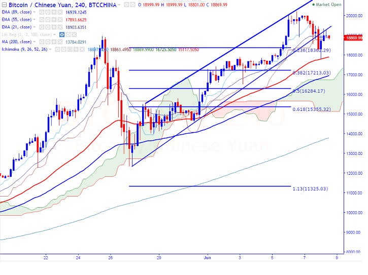 BTC/CNY has shown a huge decline after hitting all time of high of 20221 levels (BTCCHINA). The pair declined till 17796 and shown a minor recovery from the low. It is currently trading around 18815 at press time.