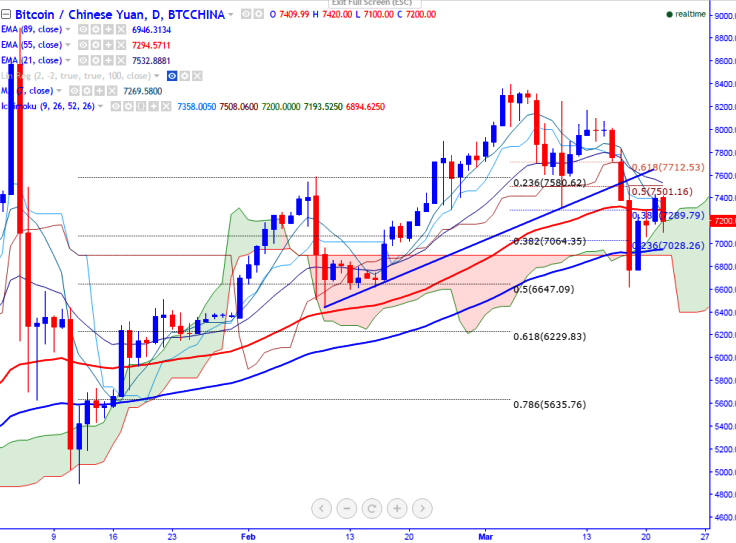 Long-term trend remains to be bullish. BTC/CNY faces strong support at 89- day EMA and any break will drag the pair till 6610.