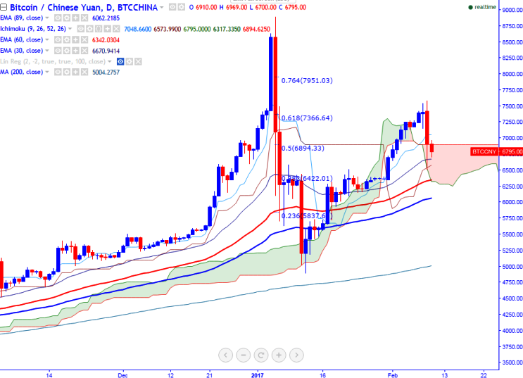 BTC/CNY is seen trading well below on Friday and the pair has shown a huge decline yesterday after jumping till 7589 level (BTCCHINA). It is currently trading around 6789 at the time of writing.