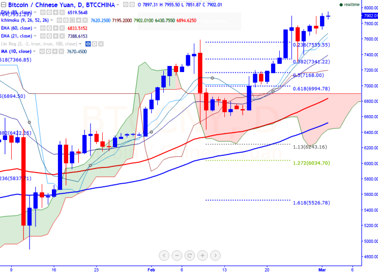 BTC/CNY is seen trading slightly above on Thursday. The pair has broken minor top at 7902 made on Fe b24th 2017 and jumped till 7955 levels (BTCCHINA). It is currently trading around 7910 at the time of writing.