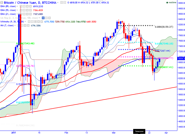 BTC/CNY pair continuing its winning streak for past three days after making a low of 6119 on Mar 25th, 2017 low (BTCCHINA). It is currently trading around 6920 at the time of writing.