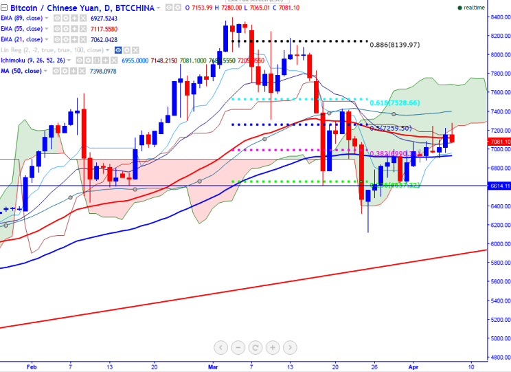 BTC/CNY is seen trading low in red on Friday and the pair has broken the high of 7250 made on Apr 4th, 2017 and slightly declined from that level (BTCCHINA). It is currently trading around 7070 at the time of writing.