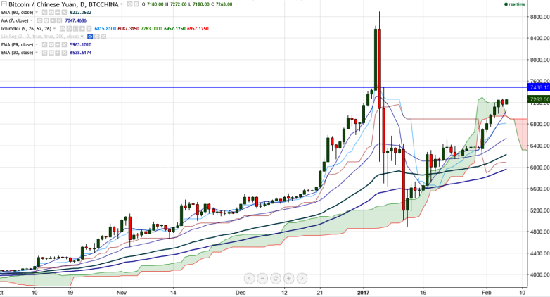 BTC/CNY is seen trading slightly above on Monday. The pair breaks ichimoku cloud top and jumped till 7281 yesterday (BTCCHINA). It is currently trading around 7272.71 at the time of writing.
