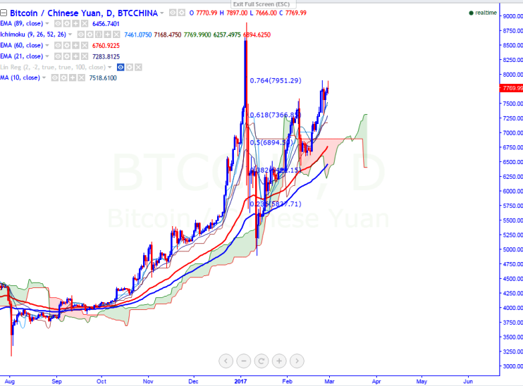 BTC/CNY is seen trading slightly high on Tuesday. The pair has once again shown a minor decline after jumping till 7897 levels (BTCCHINA). It is currently trading around 7782 at the time of writing.