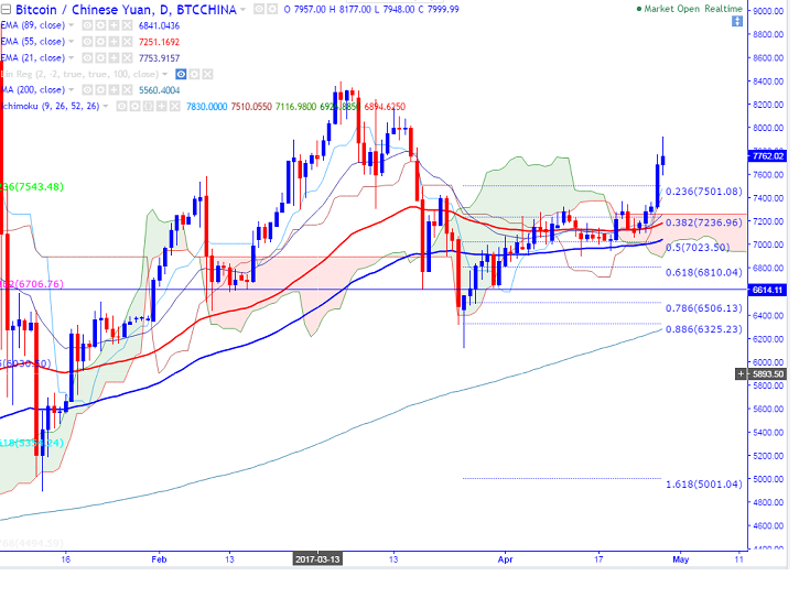 Major resistance is around 7925 (78.6% retracement of 8400 and 6119) and any break above will take the pair till 8177 (Mar 13th high)/8400 (Mar 4th 2017 high). Short term support is seen at 7500 (23.6% retracement of 6119 and 7928) and any break below the will drag the pair down till 7317 (daily Kijun-Sen)/7200 (21 – day EMA).