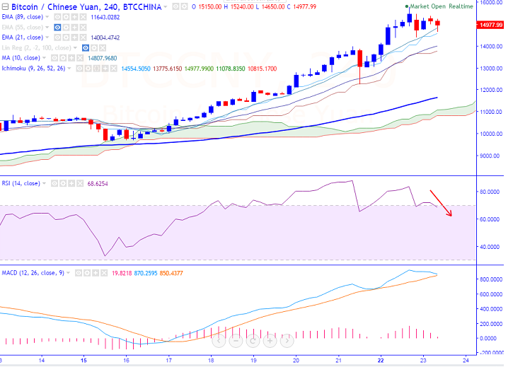 BTC/CNY has formed a temporary top around 15800 and shown a minor decline from that level (BTCCHINA). It is currently trading around 14979 at the time of writing. The pair has formed a minor bottom around 12267 and any further weakness can be seen below that level.