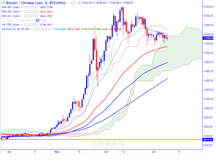 Long-term trend remains to be bullish. BTC/CNY faces minor support at 16640 (55- day EMA) and any break below confirms minor weakness.