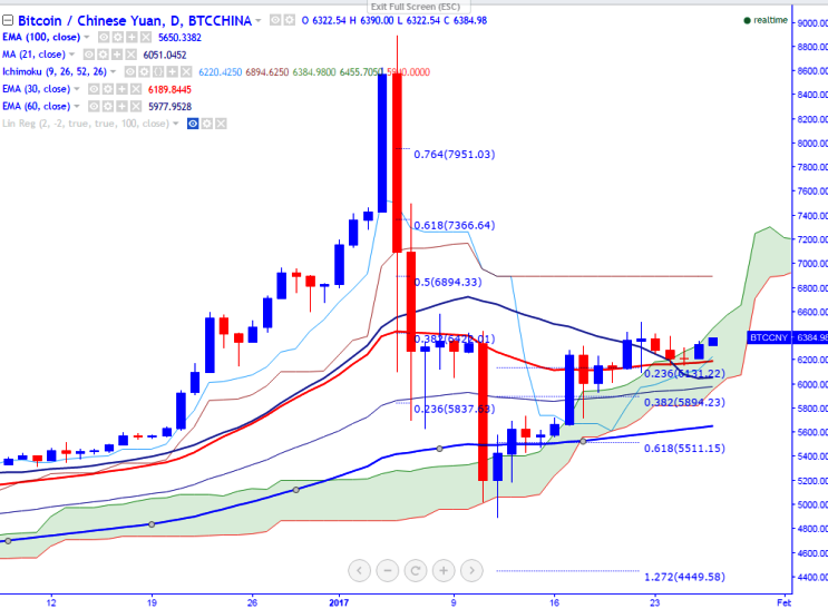 BTC/CNY is recovering slightly from the low of 6157 made on Jan 25th, 2017 (BTCCHINA). It is currently trading around 6384 at the time of writing.