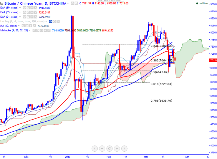 Long-term trend remains to be bullish. BTC/CNY faces strong support at 6600 and any break will drag the pair till 6229.
