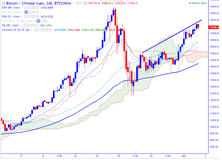 BTC/CNY has slightly declined after hitting high of 17688 at the time of writing (BTCCHINA). It is currently trading around 17406.
