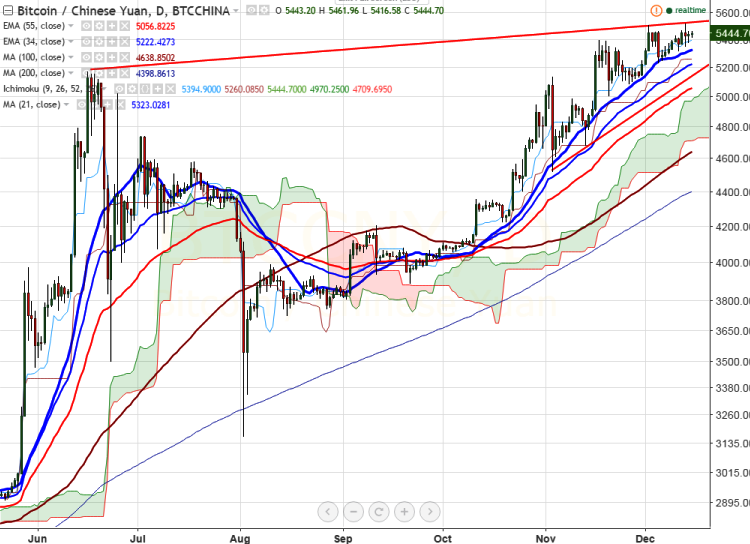 BTC/CNY has once again jumped slightly after declining till 5376 levels (BTCCCHINA). It is currently trading around 5442 at the time of writing.