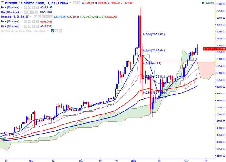 Long-term trend remains to be bullish. BTC/CNY breaks the high made on Jan 6th, 2017 at 7500 and this confirms minor bullishness a jump till 7785 likely.