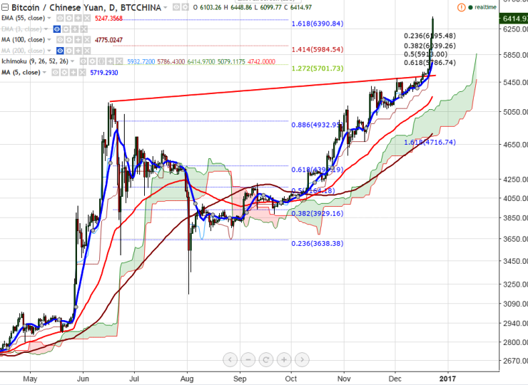 BTC/CNY is seen trading well above on Friday. The pair has broken a minor resistance of 6200 and jumped till 6448 levels (BTCCCHINA). BTC/CNY has closed well above 6000 yesterday and is currently trading around 6418.46 at the time of writing.