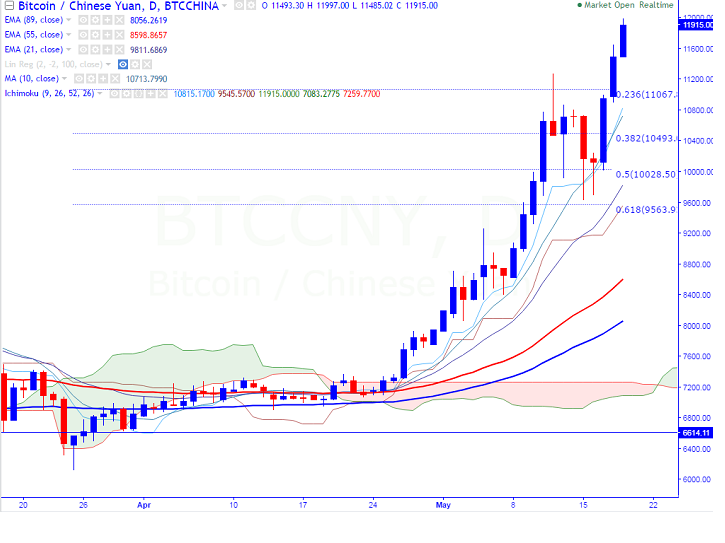 BTC/CNY has broken all time high of 11650 and hits fresh high at 11997 levels (BTCCHINA). It is currently trading around 11939 at the time of writing.