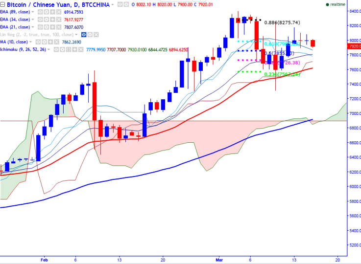 BTC/CNY is seen trading high above on Thursday and the pair is trading in a narrow range between 8177 and 7893 for the past three trading session. It is currently trading around 7910 at press time.