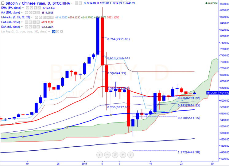 BTC/CNY pair trades in a narrow range between 6513 and 6157 for the past 4 trading sessions (BTCCHINA). It is currently trading around 6235 at the time of writing.