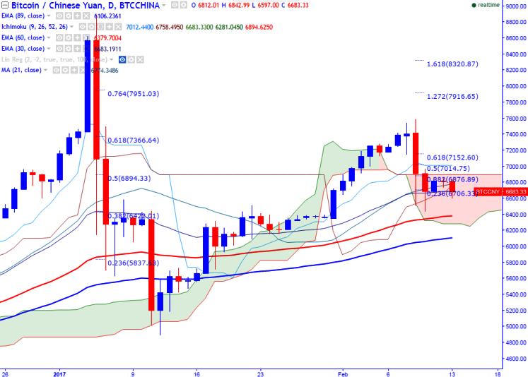 The pair has shown a mild short covering till 6860 after showing huge sell off till 6434 on Feb 10th 2017. BTCC/CNY struggling to hold at higher levels and started to show a dip from the high of 6860.It is currently trading around 6685.63.