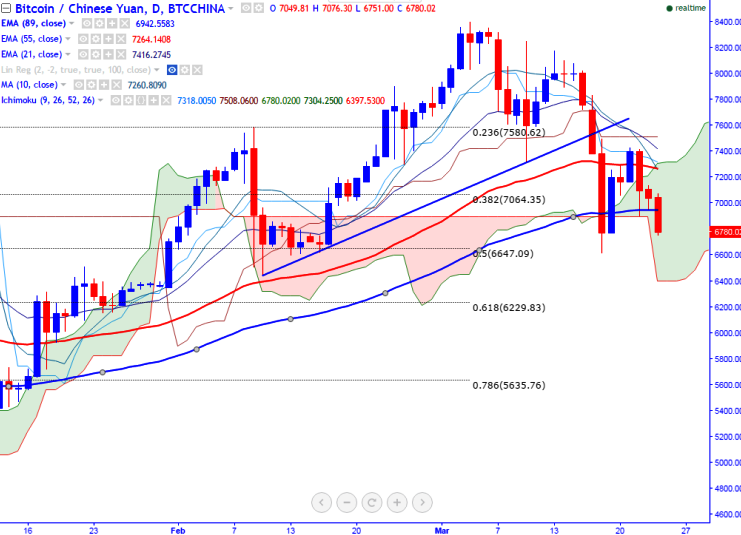BTC/CNY is seen trading slightly below in red on Friday and the pair has broken 89- day EMA and declined till 6751 (BTCCHINA). It is currently trading around 6780 at the time of writing.