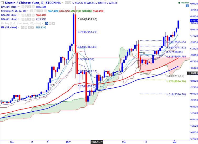 Long-term trend remains to be bullish. BTC/CNY trades well above 8000 and a jump till 8896 (Jan 5th, 2017 high) likely.