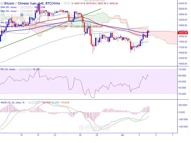 Long-term trend remains to be bullish. BTC/CNY faces strong resistance at 18679 (200- 4H MA) and any break above confirms further bullsihness.