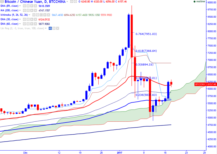 BTC/CNY has jumped till 6320 at the time of writing after breaking above 6000 levels (BTCCHINA). It is currently trading around 6156 at the time of writing.