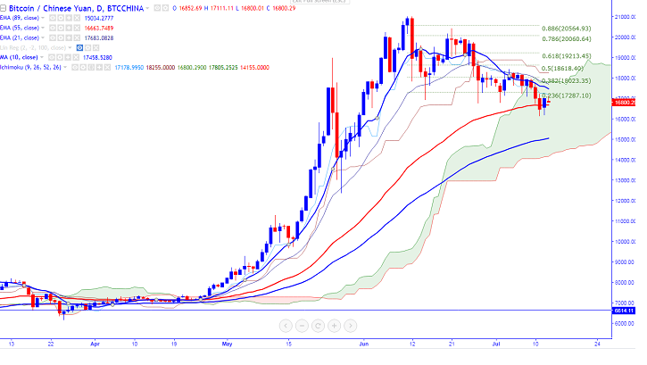 BTC/CNY has recovered till 17111 at the time of writing after hitting low of 16110 on Jul 11th 2017 (BTCCHINA). It is currently trading around 16800 at the time of writing.