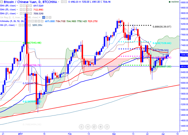 BTC/CNY is seen trading slightly above on Tuesday and the pair has shown a jump till 7250 and slightly declined from that level (BTCCHINA). It is currently trading around 7026.02 at the time of writing.