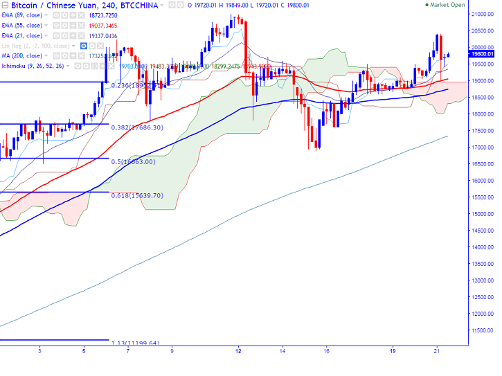 Long-term trend remains to be bullish. BTC/CNY downside capped by 55-4H EMA and any close below confirms minor bearishness.