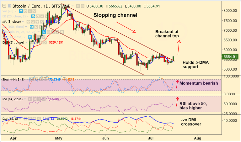 - BTC/EUR trades 3.58% higher on the day at 5633 at the time of writing.