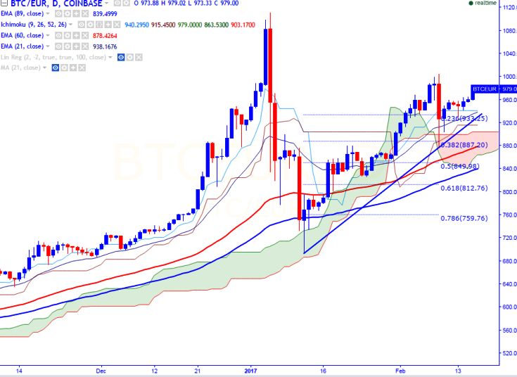 BTC/EUR is seen trading slightly above on Friday and the pair breaks a minor resistance of 964.08 high made on Feb 14th and jumped slightly till 980 levels (COINBASE). It is currently trading around 978 at the time of writing.