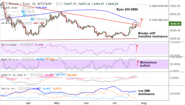 - BTC/EUR breaks major trendline resistance at 6650, bias remains higher.