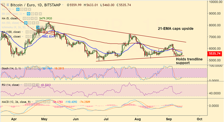 - The pair finds strong resistance at 21-EMA at 5683 and we see minor upside only on break above.