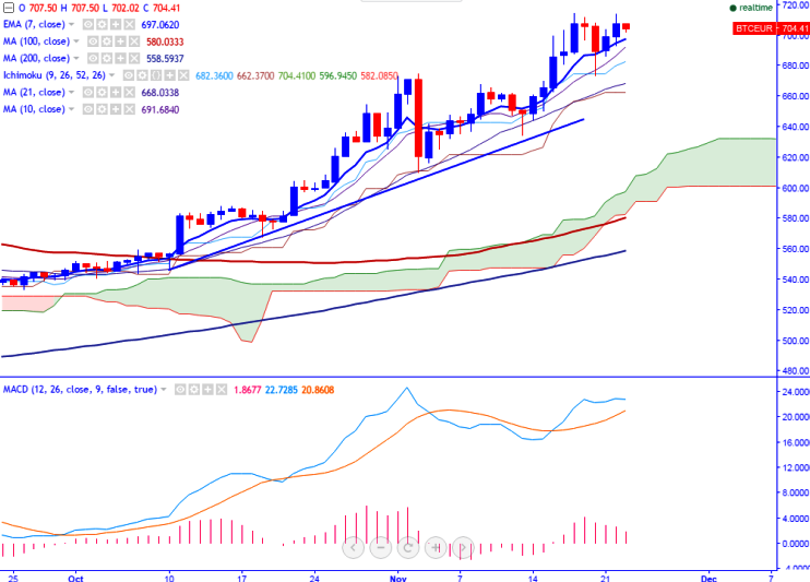 BTC/EUR is seen trading slightly below today. The pair has recovered after showing a slight dip till 693 levels (COINBASE). It is currently trading around 703 at the time of writing.
