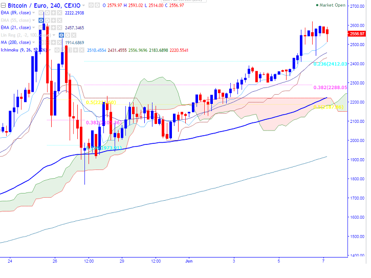 BTC/EUR has recovered sharply after forming a minor bottom around 1940 and jumped till 2621 levels (CEXIO). Intraday weakness can be seen only below 2420 level. It is currently trading around 2539 at the time of writing.