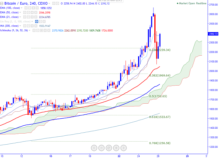 The surging bitcoin has blown away the stock market bull run and has nearly tripled its value in past 12 months. BTC/EUR shown a profit booking after hitting fresh all-time high at 2675 levels (CEXIO). The pair has formed a minor bottom around 1908 on May 22nd 2017 and any minor weakness can be seen only below that level. It is currently trading at 2391.80.