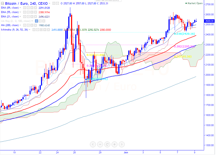 BTC/EUR has recovered slightly after making a low of 2321 levels (CEXIO). Intraday weakness can be seen only below 2334 (55- 4H EMA) level. It is currently trading around 2511 at press time.