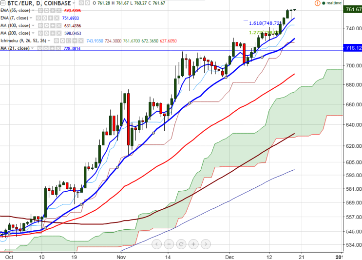 BTC/EUR is seen trading well above on Monday. The pair breaks major resistance at 748 and jumped till 761.67 yesterday (COINBASE). It is currently trading around 761.25 at the time of writing.