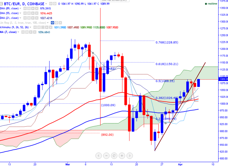 BTC/EUR is seen trading above on Thursday and the pair has recovered slightly after declining till 1047 levels (COINBASE). It is currently trading around 1089.97 at the time of writing.