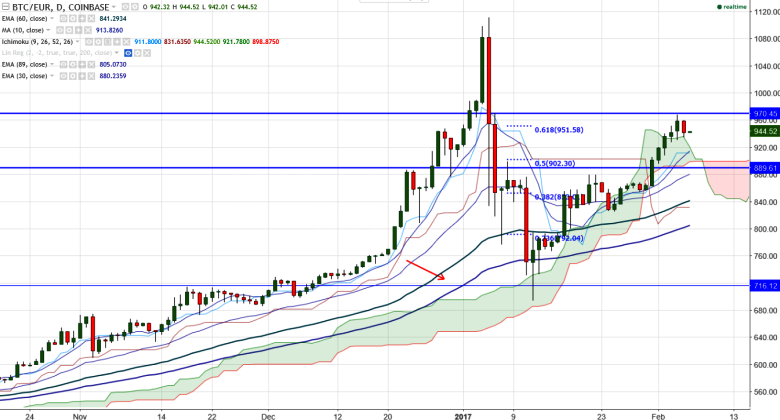 BTC/EUR is seen trading slightly above on Monday and the pair has broken major resistance at 61.8% fibo and jumped till 968 level (COINBASE).It is currently trading around 946.30 at the time of writing.