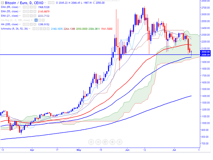 BTC/EUR has broken major support at 2000 and declined till 1987 levels (CEXIO). The pair shown a minor recovery till 2068 and is currently trading around 2050 at the time of writing.