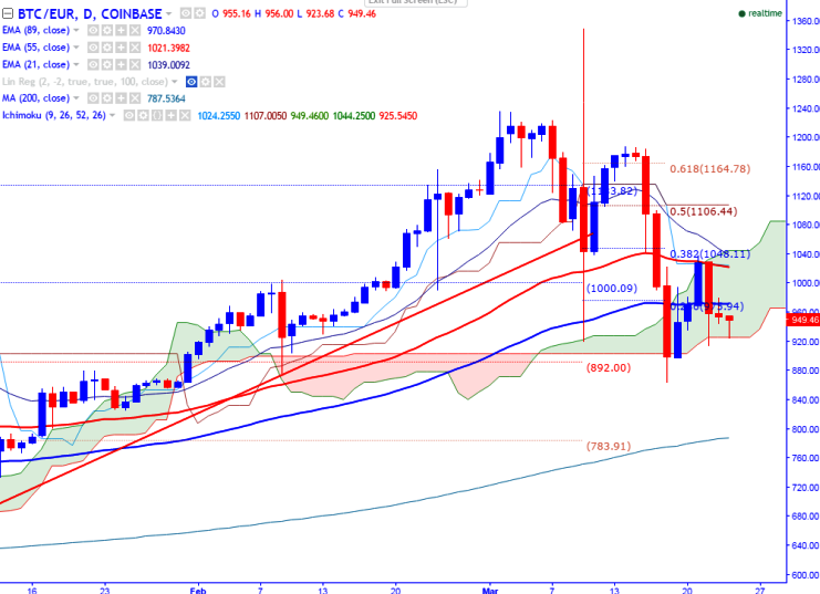 BTC/EUR breaks major support at 971 (89 days EMA) and declined till 913.70 on Mar 22nd, 2017 (COINBASE). The pair hits 1029 yesterday and it is currently trading around 942.76 at the time of writing.
