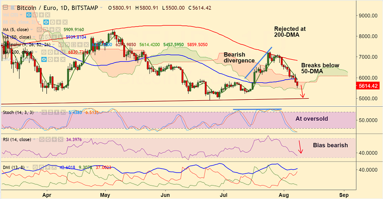 - BTC/EUR edges higher from 4-week lows at 5500, trades at 5614 at the time of writing.