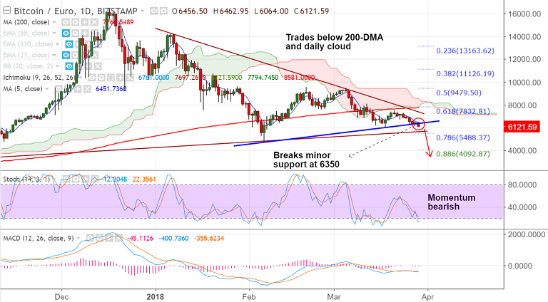 - BTC/EUR extends weakness after break below minor trendline support at 6350, bias lower.