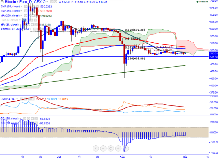 BTC/EUR is seen trading below in red on Thursday. The pair is trading flat between 519 and 5008.17 for the past three trading session (CEXIO). It is currently trading around 511.54 at the time of writing.
