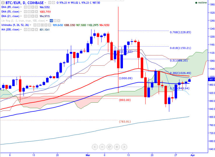 BTC/EUR pair has recovered slightly after declining till 932 on Mar 29th, 2017 (COINBASE). It is currently trading around 990.12 at the time of writing.