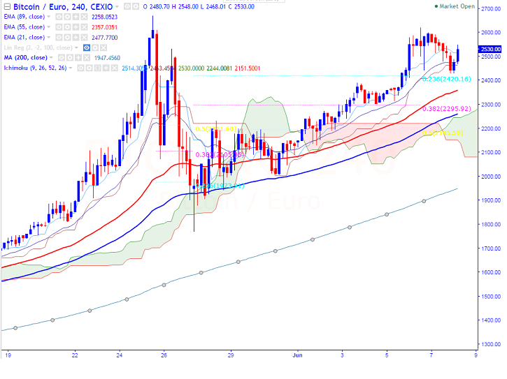 BTC/EUR has made a minor top around 2621 on Jun 6th 2017 and shown a minor profit booking form that level (CEXIO). Intraday weakness can be seen only below 2420 level. It is currently trading around 2530 at press time.