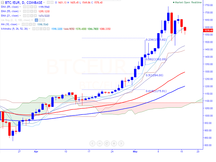 BTC/EUR retreated once again after jumping till 1683 on May 14th 2017. The pair formed a temporary top around 1742 on May 11th 2017 and declining from that level (COINBASE). It is currently trading around 1579 at press time.