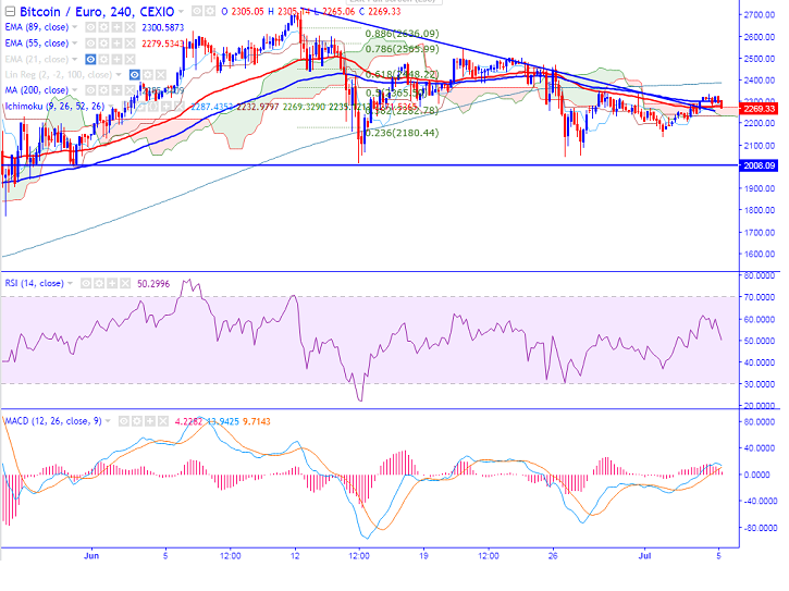 BTC/EUR has shown minor weakness after hitting a high of 2332 levels (CEXIO). The pair’s minor bottom is around 2015 and further selling can be seen only below that level. It is currently trading around 2269 at press time.