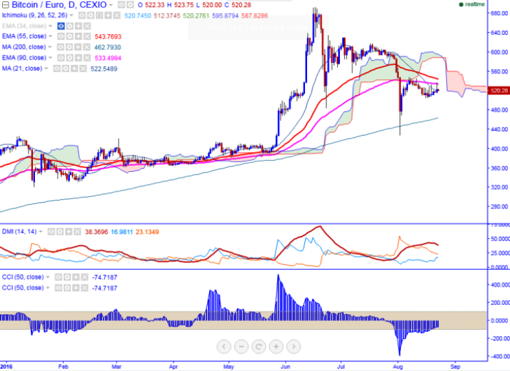 Long-term trend remains to be bullish. In the daily chart, BTC/EUR is facing strong resistance at 545 (55-day EMA) and any violation below confirms minor bullishness.
