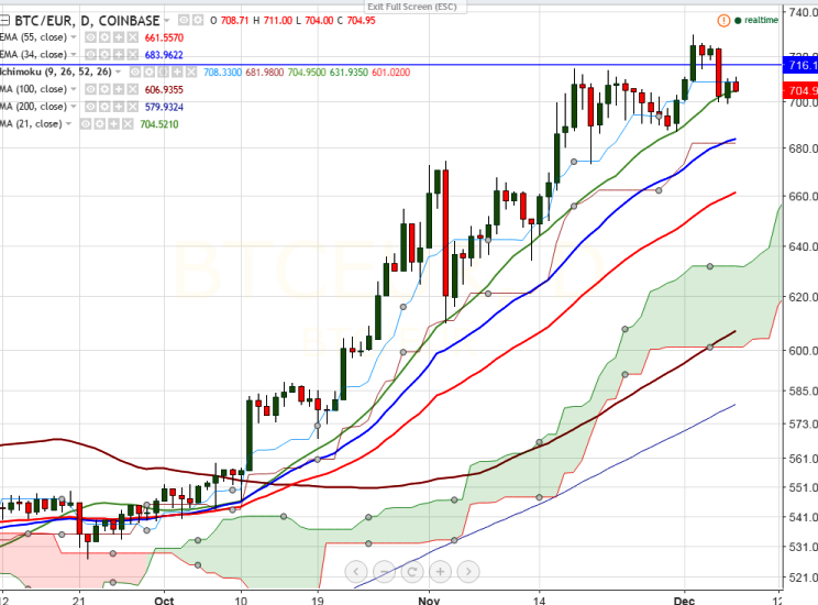 BTC/EUR is seen trading below on Wednesday. The pair declined slightly below psychological level 700 and jumped very lightly from that level (COINBASE). It is currently trading around 704.74 at the time of writing.